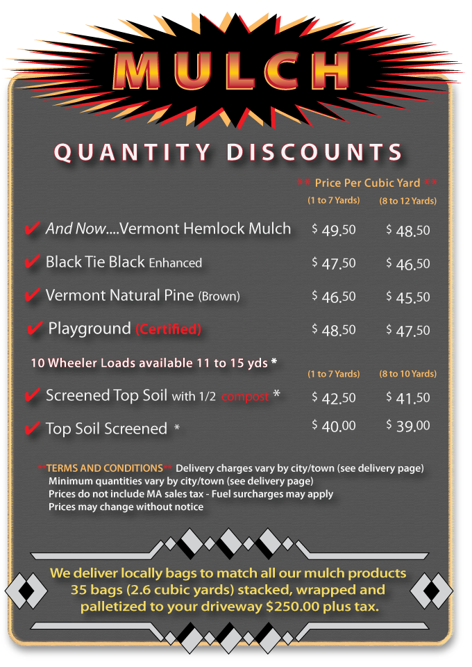 MyMulchMan.com is a 3rd generation since 1910 delivering natural earth products from the same location. We are dedicated to quality work and customer satisfaction! We offer competitive retail prices on cubic yards of quality mulch with our signature delivery service. Our mulch contains no ground brush or wood pallets. We are supplied by one of the largest forest mulch facilities in New England. See our 'GALLERY' page for product photos. The 'DELIVERY' page shows delivery charges and minimums by town. All deliveries are made to your marker in your driveway. We back up to the marker and pull forward for the product to fall out of the truck.