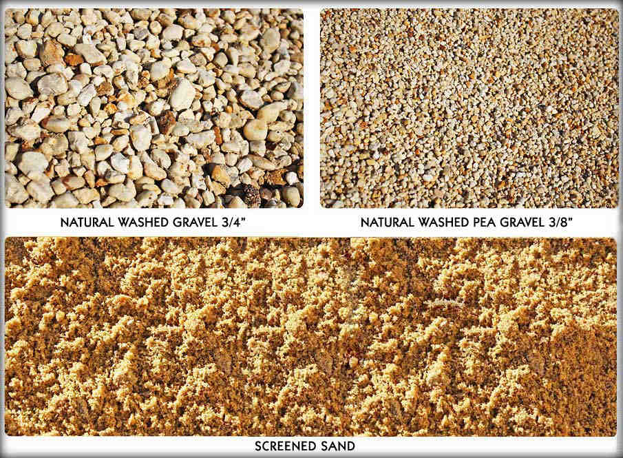 Washed Sand Washed Stone 1/2", 3/4" other sizes available Pea Gravel 3/8" Site Pack Stone Dust Crushed